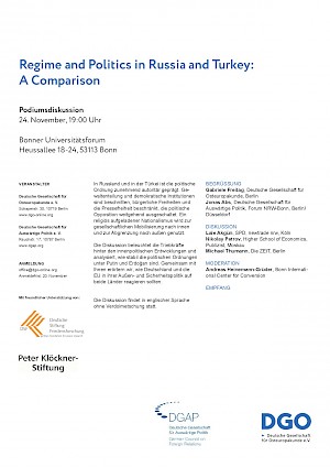 Die Veranstaltung ist Teil der DGO-Fachtagung Politik, die am 24. und 25. November zum Thema “The Political Regimes in Russia and Turkey: A Comparison” in Bonn stattfindet. Die Podiumsdiskussion ist eine Kooperationsveranstaltung mit der Deutschen Gesellschaft für Auswärtige Politik und wird unterstützt durch die Peter-Klöckner-Stiftung.