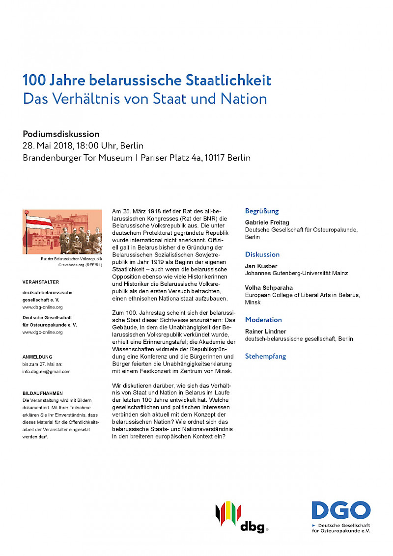 Fragt man nach dem Gründungstag des belarussischen Staates, so gibt es darauf mindestens zwei Antworten. Folgt man der ersten, so jährte sich die Gründung von Belarus am 25. März 2018 zum 100. Mal: 1918 rief der Rat des all-belarussischen Kongresses die Volksrepublik Belarus (BNR) aus. Diese Antwort erhält man vor allem von der belarussischen Opposition und vielen belarussischen Historikern. Die offizielle Antwort lautete bisher: 1. Januar 1919. An diesem Tag wurde die Belarussische Sozialistische Sowjetrepublik (BSSR) ausgerufen. Verschiedene Zeichen deuten jedoch darauf hin, dass auch die heutige Regierung dem 25. März 1918 inzwischen mehr Bedeutung beimisst: Das Gebäude, in dem die Unabhängigkeit der Belarussischen Volksrepublik verkündet wurde, erhielt eine Erinnerungstafel; die Akademie der Wissenschaften widmete der Republikgründung eine Konferenz und die Bürgerinnen und Bürger feierten die Unabhängigkeitserklärung mit einem Festkonzert im Zentrum von Minsk. Darüber, wie sich das Verhältnis von Staat und Nation in Belarus im Laufe der letzten 100 Jahre entwickelt hat, diskutierten Jan Kusber (Johannes Gutenberg-Universität Mainz), Volha Schparaha (European College of Liberal Arts in Belarus, ECLAB, Minsk) und Rainer Lindner (deutsch-belarussische gesellschaft, Berlin). Welche gesellschaftlichen und politischen Interessen verbinden sich aktuell mit dem Konzept der belarussischen Nation? Wie ordnet sich das belarussische Staats- und Nationsverständnis in den breiteren europäischen Kontext ein?