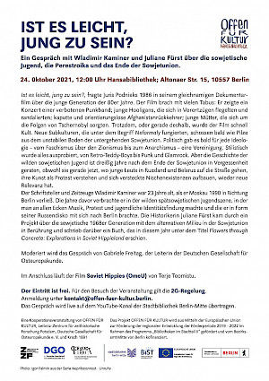 Der Schriftsteller und Zeitzeuge Wladimir KAMINER, der seine Jugend in der spätsowjetischen Hippiebewegung verbrachte, und die Historikerin Juliane FÜRST, die zur sowjetischen 1968er-Generation und der alternativen Szene der Sowjetunion forscht, unterhielten sich über die sowjetische Jugendszene. Dabei gingen sie unter anderem den Fragen nach, wie „leicht“ oder „schwer“ es war, als Hippie in der Sowjetunion abseits der Gesellschaft zu leben, welche Freiheiten die Jugendlichen hatten, welchen Zwängen sie ausgesetzt waren und welche Berührungspunkte es mit westlichen Subkulturen gab.