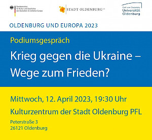 Über ein Jahr dauert der russische Angriffskrieg gegen die Ukraine bereits an. Auch in Oldenburg leben mittlerweile zahlreiche Flüchtlinge aus dem Kriegsgebiet. Viele Menschen in der Stadt bewegt die Frage nach möglichen Wegen und geeigneten Mitteln zur Beendigung dieses Krieges. Wie kann ein gerechter Frieden erreicht werden? Unter der Beteiligung von Stimmen aus der Ukraine und aus dem russischen Exil soll in dem Podiumsgespräch neben der politischen insbesondere auch die ethische Dimension unseres Handelns diskutiert werden.